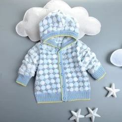 Unisex hooded cardigan to stylishly protect kids between the ages 0-3 from harsh weather conditions.