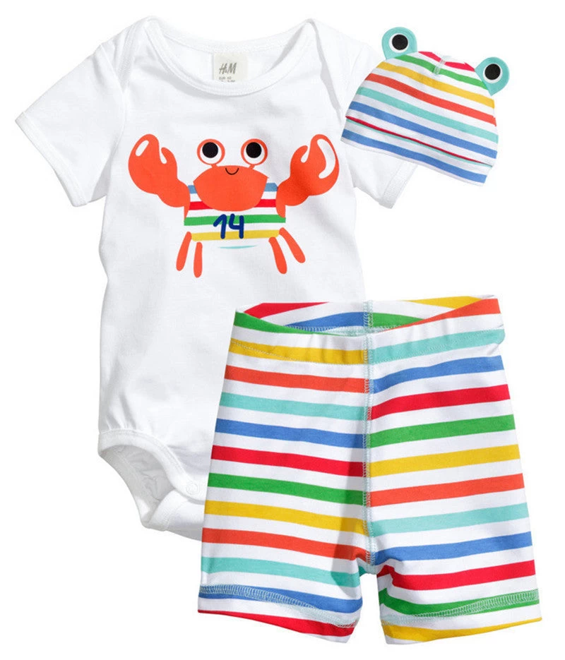 Charactered patterned three pieces cute unisex baby rompers. It also comes with a stylish head warmer and good summer season.