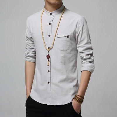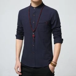 This is an appealing shirt that is made for sports and leisure. It is single breasted and made of cotton and linen with a mandarin collar.