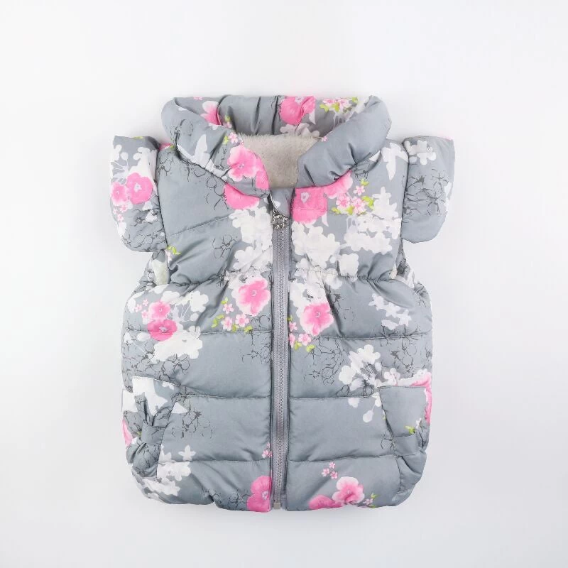 A sleeveless floral patterned kid girls regular coat with turtle neck collars and of American and European style.