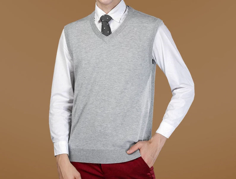 Sleeveless vest for men that is flat knitted and made from cashmere and wool material. It has a V-Neck collar and a regular sleeve style.