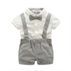 Introducing the perfect baby boy clothing set born infant clothing 2pcs short sleeve t-shirt + suspender gentleman suit, designed to give your little one a fashionable and charming look. This stylish outfit combines a classic short sleeve T-shirt with an adorable bowtie and a pair of suspenders, making it the ideal choice for any special occasion or casual outing. Your tiny gentleman will not only feel comfortable but will also turn heads wherever he goes.