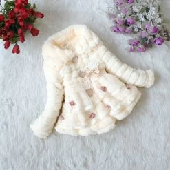 A warm jacket made out of faux fur fleece with a turn-down collar for baby girls suitable for snow conditions and during Christmas.