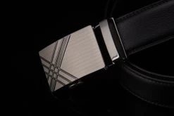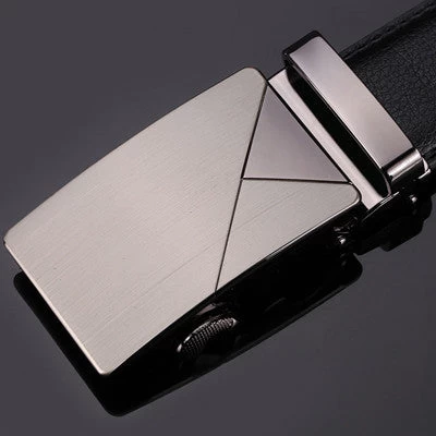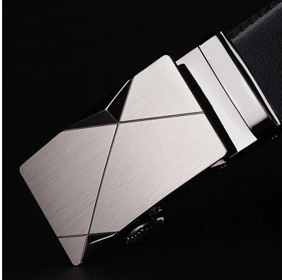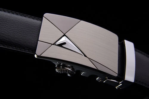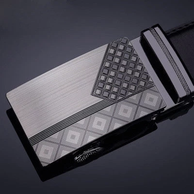 A black brand designer men leather belts with automatic buckle and geometric pattern for business men with high quality and luxury.