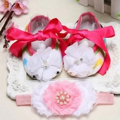 Featuring a delightful floral pattern and adorned with sparkling rhinestones, these booties are not only stylish but also incredibly comfortable. The elastic band closure ensures a secure fit, allowing your baby to move freely as she takes her first steps. Made from soft cotton fabric and a PU outsole, these shoes are perfect for both spring and autumn wear.