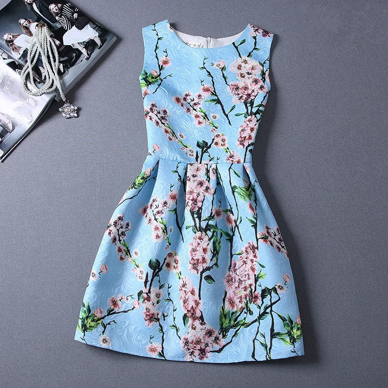 Floral print, A-line silhouette, sleeveless, dobby fabric, natural color, knee length, cotton, polyester and jacquard women spring dress.