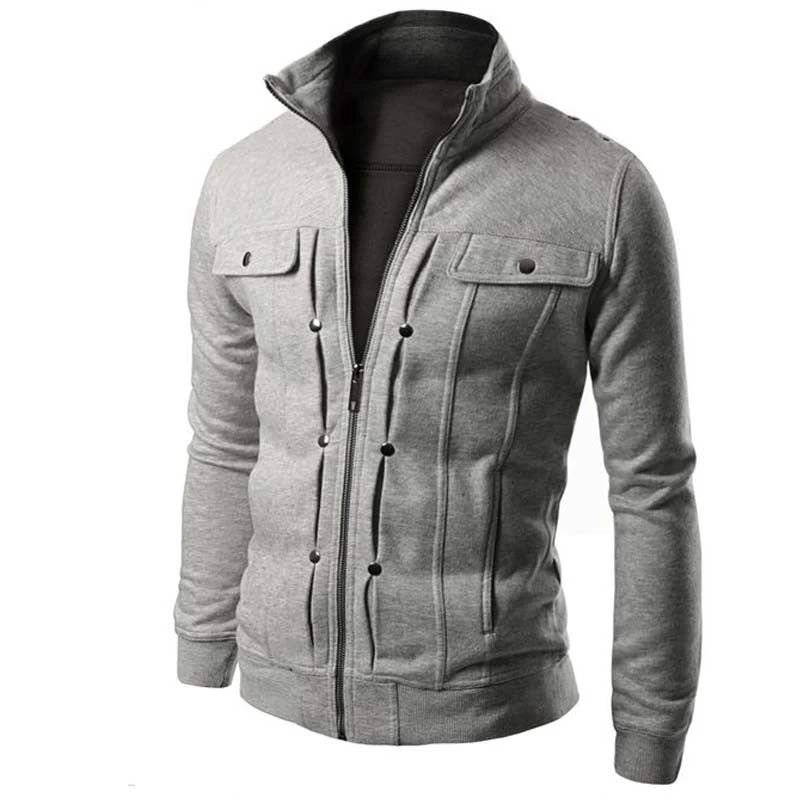 White, light grey, dark grey, black and brown color variants, slim fit, hooded, O-neck, solid pattern, zipper closure, cotton and polyester men sweatshirts.