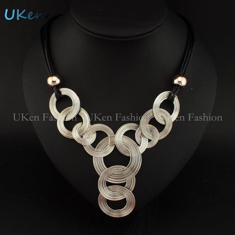 This is a choker necklace with series of circle metal wire as pendant then joined together by a black chain for women.