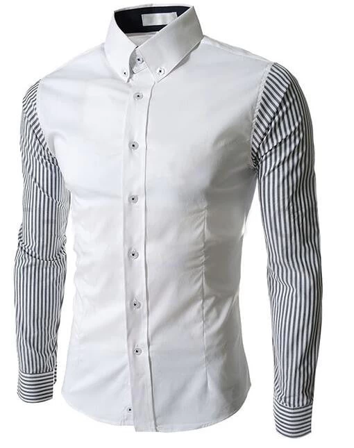 Fashion European cotton long sleeve T-shirts for men, a casual single breasted slim fit striped top with turn-down collar and patchwork pattern.