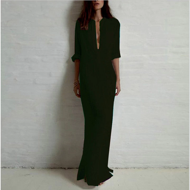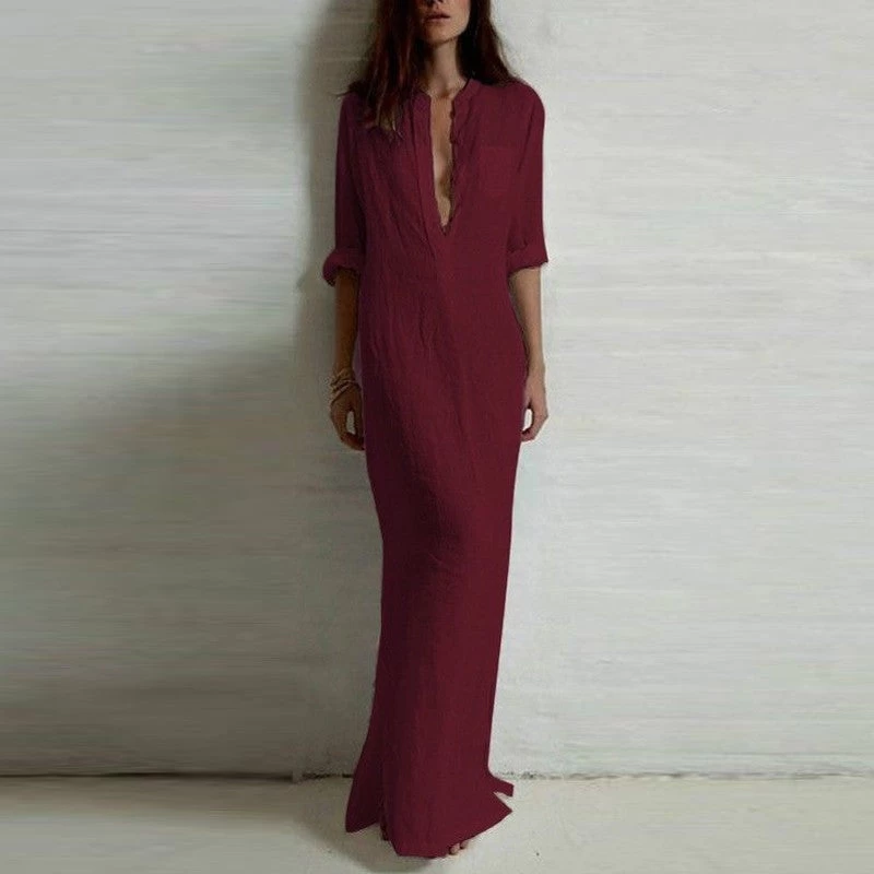 Embrace your style this autumn with the Fashion Autumn Women Sexy Casual Dress Long Sleeve Deep V Neck Linen Split Solid Long Maxi Dress Plus Size. Order now and elevate your wardrobe with a piece that combines elegance, comfort, and functionality!