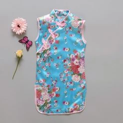 Introducing the Fashion Chinese Style Flower Birds Cotton Children’s Cloth Kids Qipao Dress Sleeveless Summer Girl’s Dress, a stunning summer dress that beautifully combines elegance and comfort for your little one. This knee-length, sleeveless dress features a captivating floral pattern that is perfect for special occasions or everyday wear. Crafted from high-quality cotton polyester, it ensures breathability and ease of movement, making it an ideal choice for warm, sunny days.