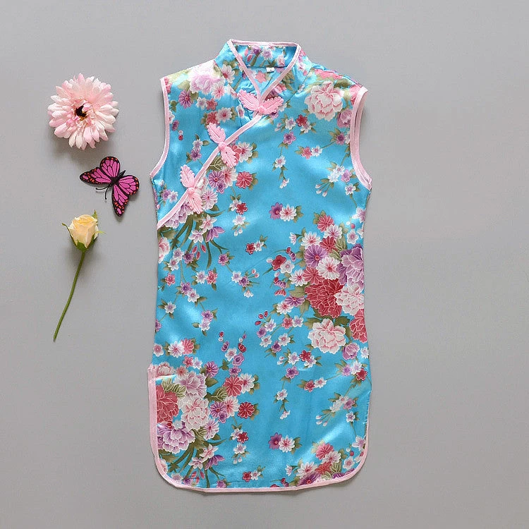 Knee-length, sleeveless, turtleneck, floral pattern, cotton polyester, Chinese style dress for little girls for an astonishing appearance.