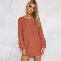 Experience the perfect combination of sexiness and sophistication with our Fashion Knitted Sweater Women winter sexy V-NECK long sleeve Lace up long pullover ladies causal solid loose top plus size. Order yours today and enhance your wardrobe with this stylish piece!