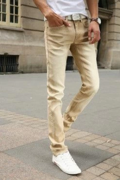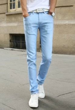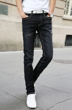 Fashionable, midweight, full length, zipper fly, denim and cotton pencil pants for men to make them look cute.