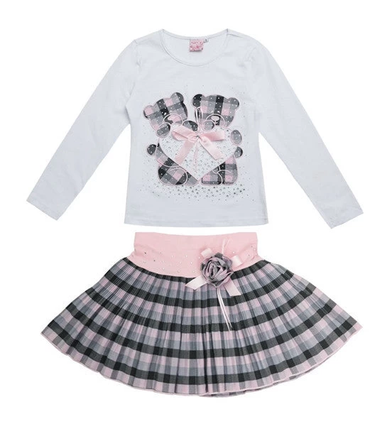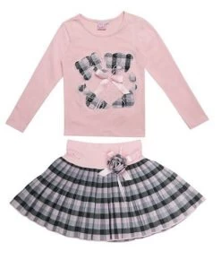 Stylish, plaid pattern, O-neck, long sleeved, spandex and cotton fashion clothing set of shirt top and tutu skirt for children.
