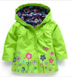 Hooded raincoat and jacket for fashionable female toddlers with flowery characters as pattern for summer season.