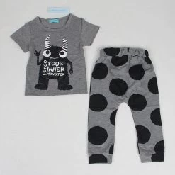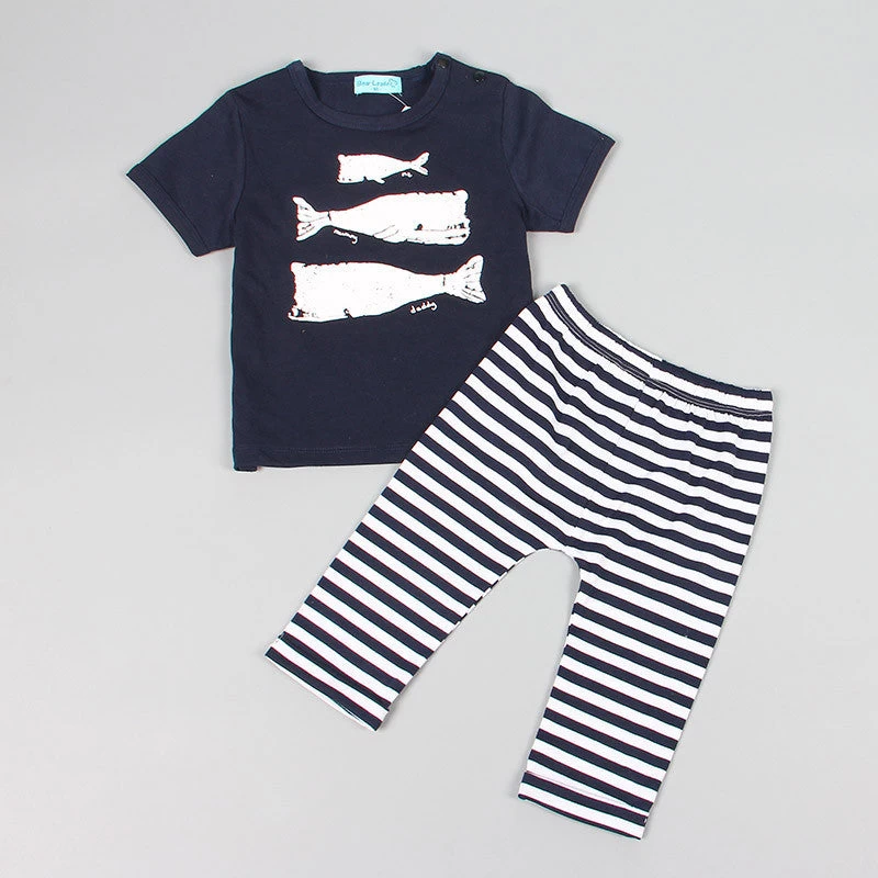 This is a Keelorn summer style 2 pieces infant boy clothes which consists of a short sleeve top with three little fish as design and a little short.