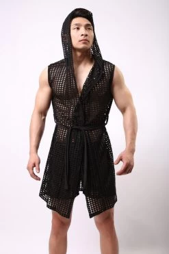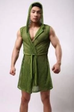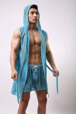 This is solid night wear for men. It is sleeveless and has a hooded collar. It is made up of 90% polyester and 10% spandex. It is a classic robe for men.