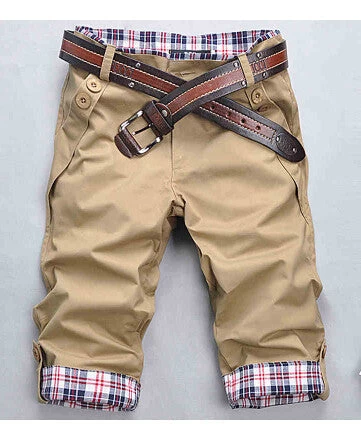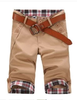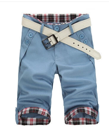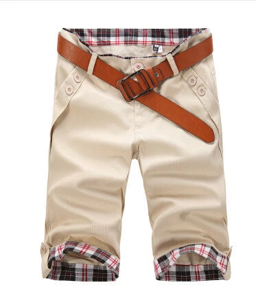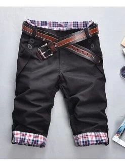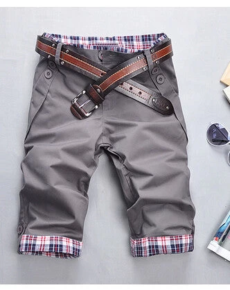 Knee length, cuff decoration, mid waist, regular fit, solid pattern with button fly closure casual spring and summer cotton shorts for men.