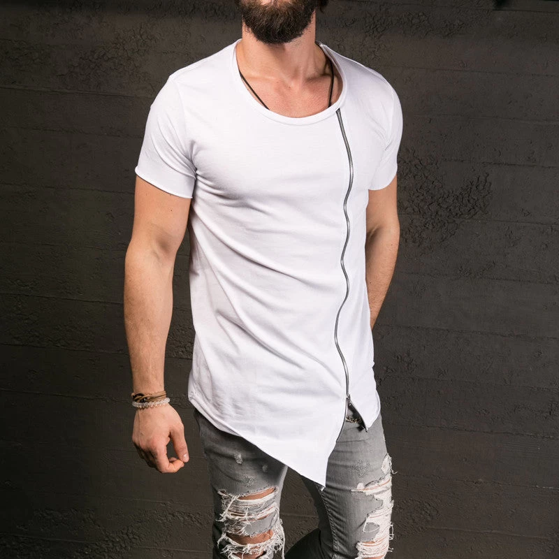 Introducing the Men’s Fashion Show Stylish Long T shirt Asymmetrical Side Zipper Big Neck Short Sleeve T-Shirt Tees, a perfect blend of comfort and modern style. Crafted from high-quality cotton, this T-shirt is designed for the fashion-forward man who appreciates both aesthetics and functionality. The unique asymmetrical side zipper and big neck design elevate this classic piece, making it a standout option for any casual occasion.