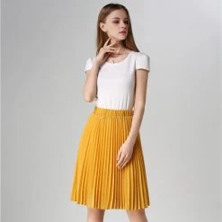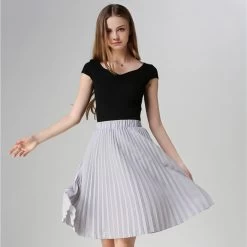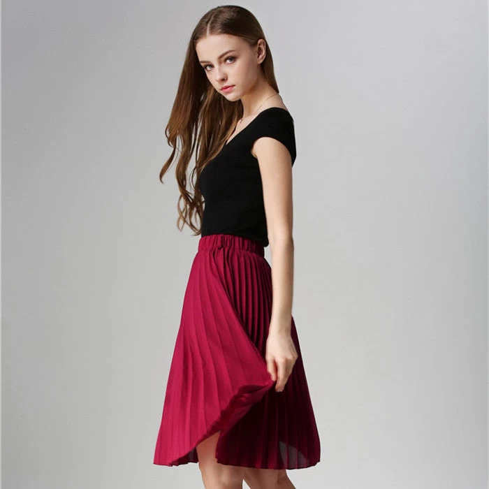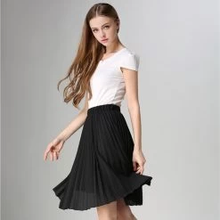 With its exquisite pleated design and flattering silhouette, this midi skirt enhances your natural curves while providing a graceful flow. The skirt is available in various colors including classic black, vibrant blue, and soft pink, allowing you to express your unique style.