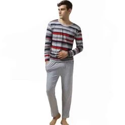 A Quanxiu pyjamas set of casual striped top of high-quality cotton materials and long pant. Also available for men of big size.