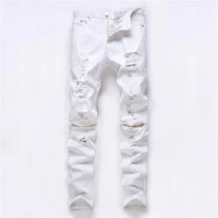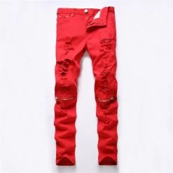 Elevate your fashion game with these stylish and durable denim pants that promise to keep you looking sharp while providing maximum comfort. You won’t want to miss out on the Red White Black Ripped Denim Pant Knee Hole Zipper Biker Jeans Men Slim Skinny Destroyed Torn Jean Pants!
