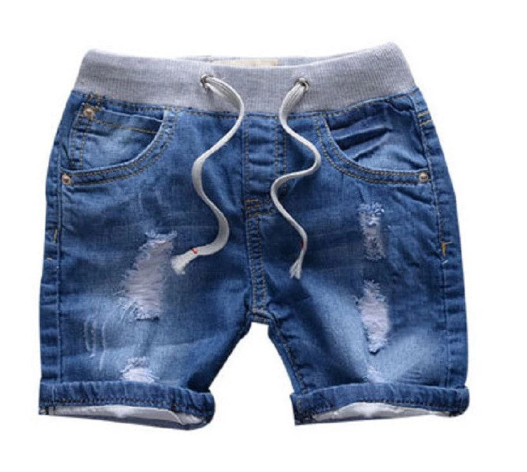 Stylish and fancy mid waist, solid pattern, drawstring closure, cotton and denim casual short ripped jeans for boys as a summer outfit.