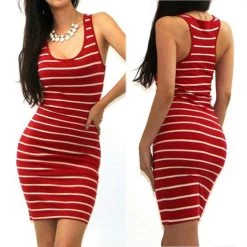 Introducing the Sexy Tank Dress Women Mini Club Beach Dress Bandage Dress Casual Striped Dresses Sleeveless Bodycon, a must-have addition to your summer wardrobe. This stunning dress features a sleek sheath silhouette that accentuates your curves, making it the perfect choice for any occasion, from beach outings to night club events. With its eye-catching striped pattern and a range of vibrant color options, including blue, black, and red, you’ll turn heads wherever you go.