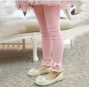 Full length, elastic waist closure, solid pattern, skinny fit, embroided flares, bow and lace decoration cotton made children leggings.