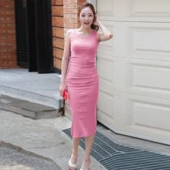A long summer beach sleeveless bodycon bottoming dress of high quality cotton material for women to show class.