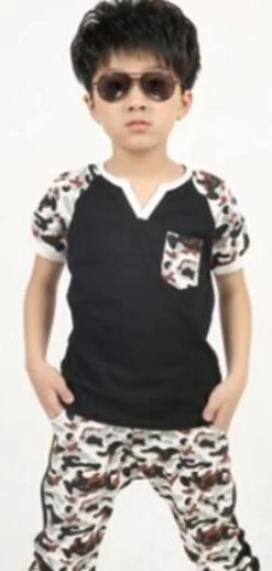 A set of two-piece outfit for kid boys. It is a casual summer outfit with camouflage design on the pant and the sleeve of the t-shirt.