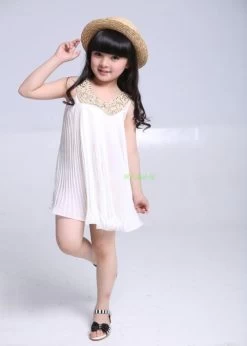 Available in two delightful colors, pink and green, this dress is perfect for summer outings, birthday parties, or family gatherings. The paillette collar adds a sparkling flair, ensuring your child stands out in any crowd. With its knee-length A-line silhouette and sleeveless style, this dress offers both comfort and freedom for your little one to play and explore.