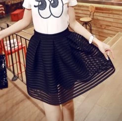 An elegant and exquisite fashionable striped hollow out back fluffy up to knee length women skirt that is best worn for ball parties.