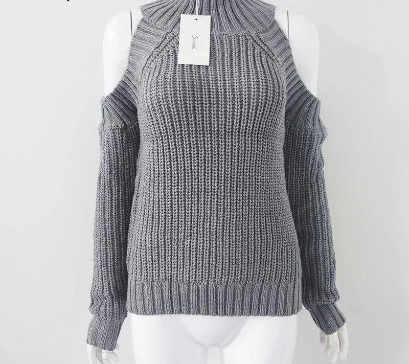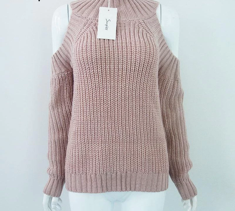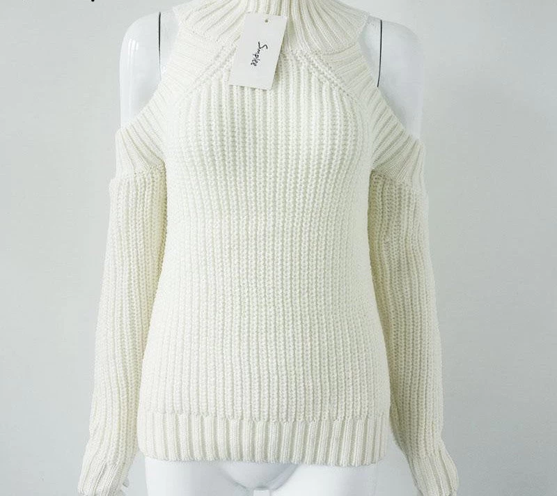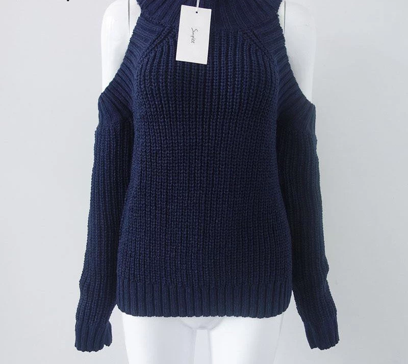 A lovely feminine pullover with turtle-neck style and off-shoulder design. The knitted pullover is a bit oversized for more style.