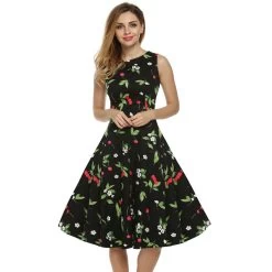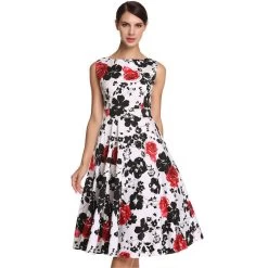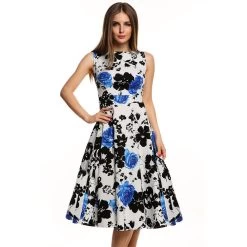A charming summer swing dress of vintage design and floral patterns for women. It has a bow-knot design as dration.