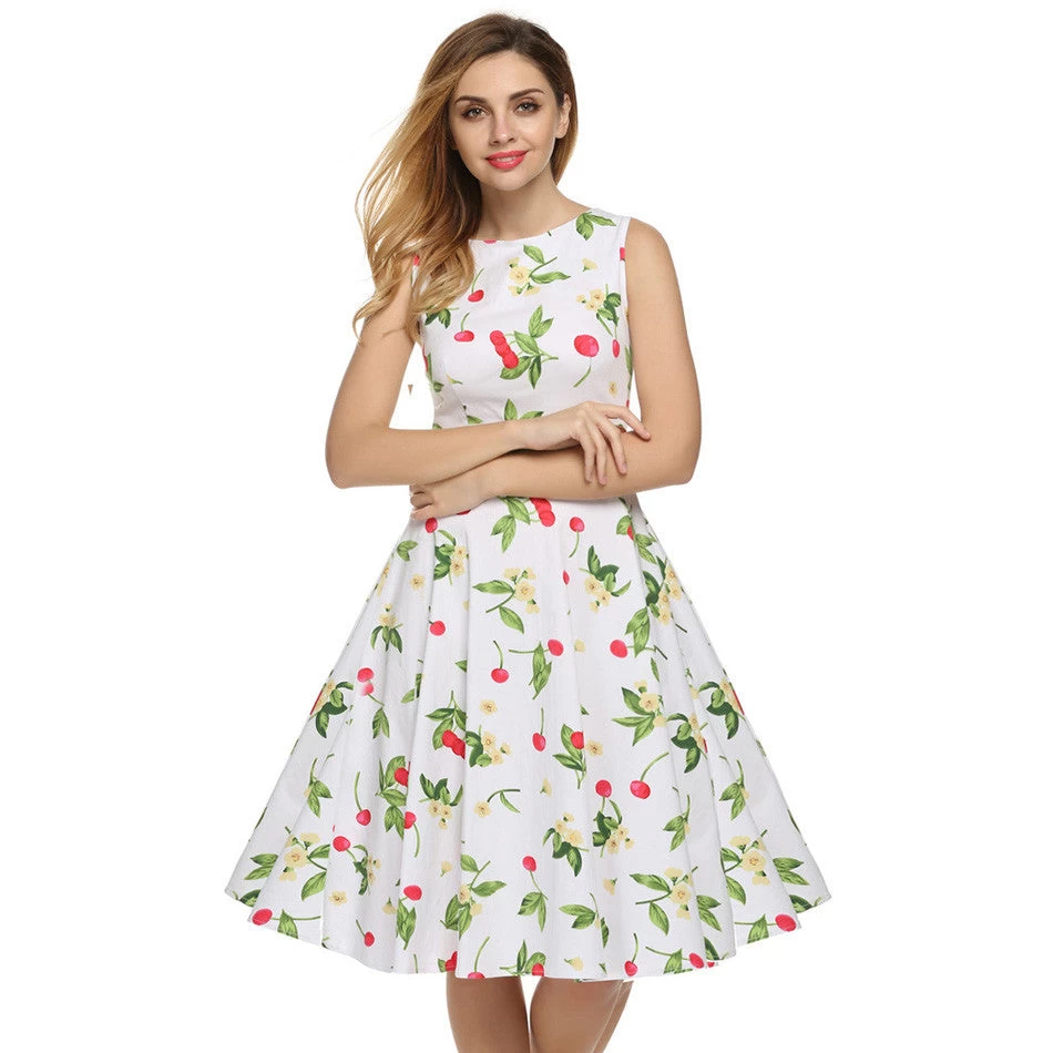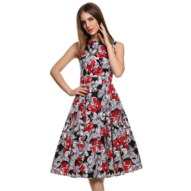 A charming summer swing dress of vintage design and floral patterns for women. It has a bow-knot design as dration.