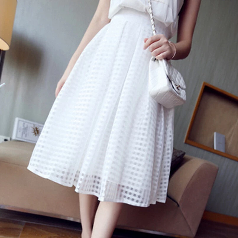 Introducing our Women summer casual long skirt high waist pleated plaid skirts womens tutu skirt brand faldas white black, the perfect addition to your warm-weather wardrobe. This stylish mid-calf skirt features a flattering empire waistline and a delightful plaid pattern, making it a versatile piece for any occasion. Crafted from a blend of high-quality materials including polyester, mesh, voile, and organza, this skirt offers a comfortable fit and an elegant silhouette.