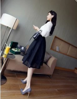 Mid-calf, empire waistline, plaid pattern, pleated silhouette, high waist, black and white color variants, polyester, mesh, voile and organza women tutu skirt.