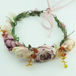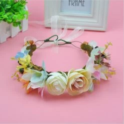 A hair accessory of wreath headband for kids that can be used at wedding parties. It is of a floral garland with ribbon and adjustable flower.